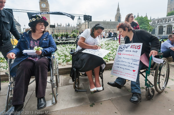 Parliament Square with flowers to represent the 10,000 who died shortly after Atos Assessments