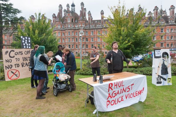Students protested after heavy-handed policing by a large group of police at Royal Holloway Students' Union last Friday when a student who challenged the racial profiling by police was jumped on, manhandled by 7 police and held for 16 hours.