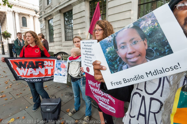 Protesters at South Africa House showed their solidarity with South African shack dwellers movement Abahlali baseMjondolo, a partner organisation of War on Want, after the shooting by police of its members and the arrest of its Secretary General.