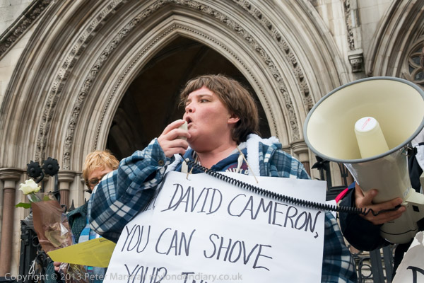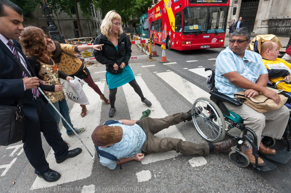 The trial continued to its inevitable guilty verdict, although there seemed to be no agreement about a suitably severe punishement, most of those suggested no longer being avaialable under UK law. The prisoner was led away (though unfortunately only to the pub opposite rather than prison) and the protest continued noisily, still blocking the road.