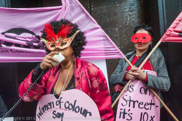 There was a minor incident when one officer complained of the language used by one of the women, who complained strongly that she had been responding to a racist remark by a passer-by, and asked why the officer had not responed to that. He replied that he had not heard the remark, but had heard her reply. He was surrounded by a group of women blowing whistles and horns and banging drums for a couple of minutes before being rescued by Pragna Patel, Director of Southall Black Sisters, who told the group they should get on with their demonstration.