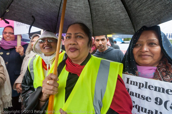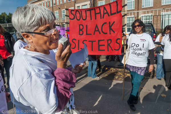 Around 30 people had found their way to this rather out of the way spot opposite Hounslow Heath when I was photographing this morning. Most were from Southall Black Sisters and wore t-shrts with the message 'Do I look illegal?', but they were joined by others from Sol-Fed and other groups. As well as the familiar bright red 'Southall Black Sisters' banner, there was also a larger one with the message 'F**K ALL RACISM - NO ONE IS ILLEGAL'
