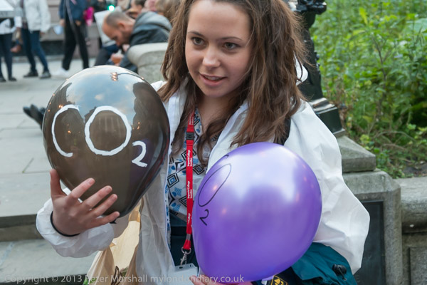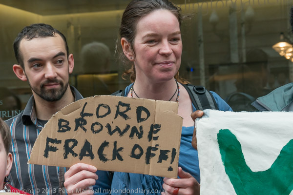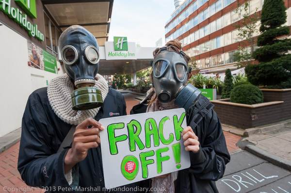 Activists protested outside the 'Shale Gas Environmental Summit' where industry figures concerned to deny the environmental impact of fracking were hearing from noted climate change denier Benny Peiser of the Global Warming Policy Foundation.