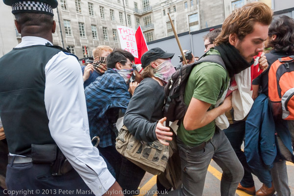 His speech was interrupted by the arrival of a larger group of police who ineffectually tried to kettle the protest. There were far to few to do so, and most protesters simply walked through the gaps in their line.