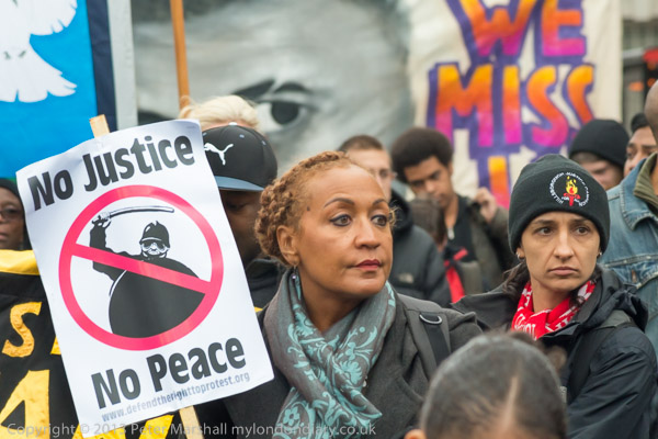 Representatives of many of these families, and some others were on today's march along with their supporters. As in previous years it gathered on the edge of Trafalgar Square before making its way down Whitehall at a funereal pace behind the main banner. Among those holding this were Stephanie Lightfoot-Bennet, twin sister of Leon Patterson, murdered by Manchester police in 1992 and Carole Duggan, the aunt of Mark Duggan whose shooting by police sparked riots in August 2011.