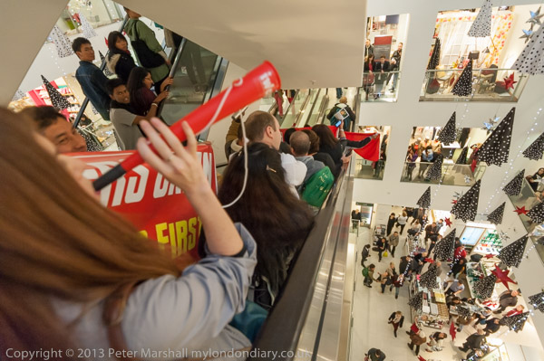 Many customers took the leaflets and expressed their support - and some clapped. As they made their way around the store the protesters took great care to avoid any damage, not always easy with some large banners, but this, although noisy and very visible, was a controlled and peaceful protest. John Lewis staff, including security generally behaved very well too, and when one man started to argue noisily with the protesters and seemed to be threatening them, he was quickly pulled away.