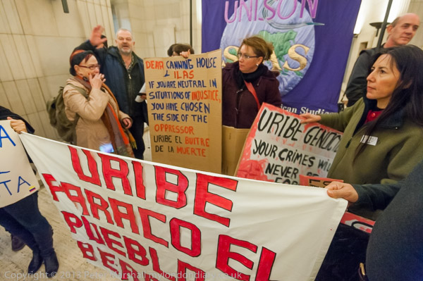Álvaro Uribe had been invited to speak at an event organised by Canning House, "a foundation dedicated to promote understanding and engagement between Britain and the Hispanic and Luso-Brazilian world" and the Institute of Latin American Studies, a part of the University of London at Senate House on the subject of peace in Colombia.