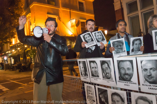 The protesters held up portraits of those arrested in the direction of the Russian Embassy across the road, and shouted for their release.