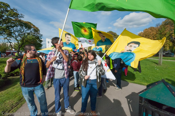 'Freedom for Ocalan - Statute for Kurdistan' in red, green and yellow - the colours of the Kurdistan flag