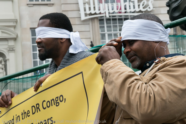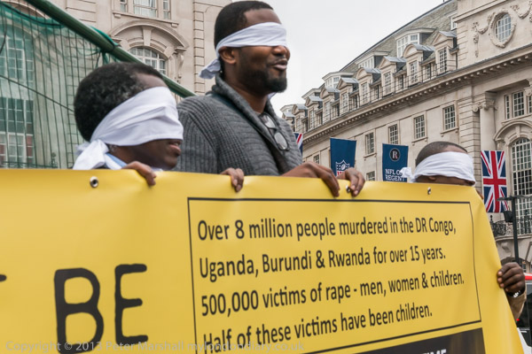 The banner give the figures - 8m murdered, 500,000 rape victims....