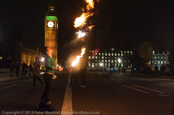 a woman blows out fire in front of Big Ben on Westminster Bridge