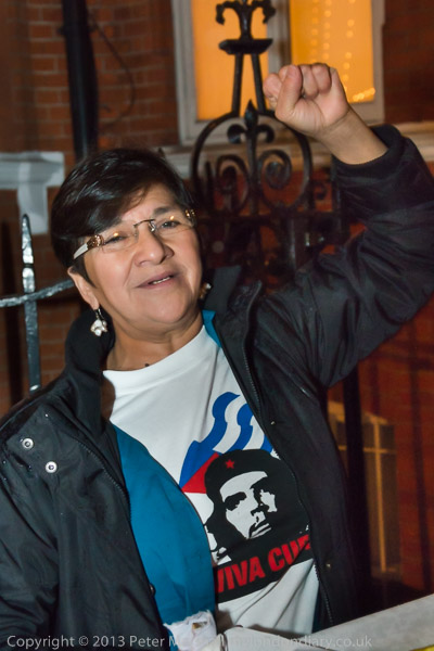 A policeman comes and asks the protesters if they would be quieter as they are disturbing the neighbours