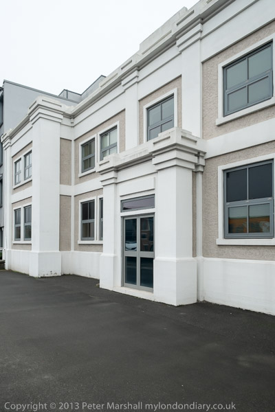 We walked along the Causeway in case there was flooding on the tow path. The offices at left are on part of the gasworks site. Water company at right