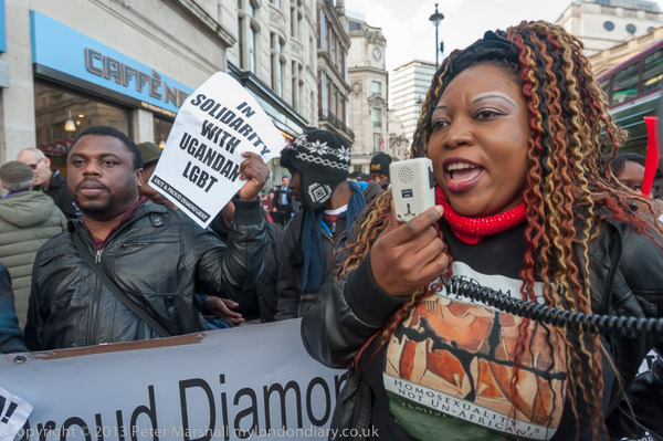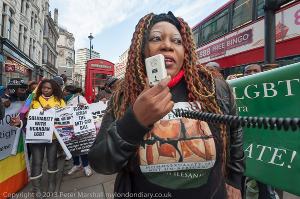 A Nigerian woman with a t-shirt stating 'Homosexuality is not un-African' speaking forcefully against the Ugandan law