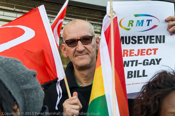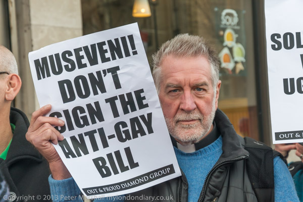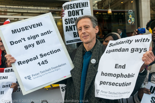 Peter Tatchell with the message of the protest to Museveni - Don't sign anti-gay Bill - Repeal Section 145'