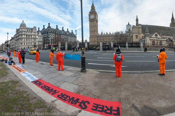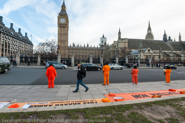 Figures in black hoods and orange suits opposite Parliament hope to remind MPs of the need to demand