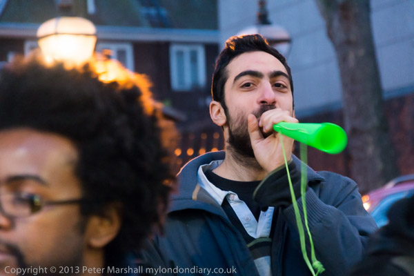 A man blows a vuvuzela to make some noise. The Israeli embassy is around 50 metres away down the road behind him