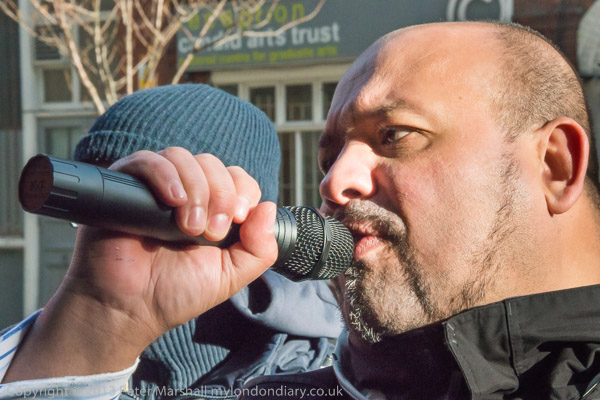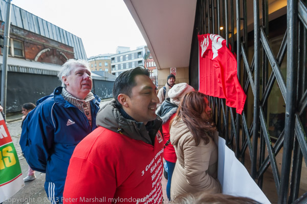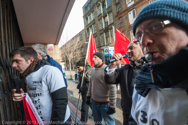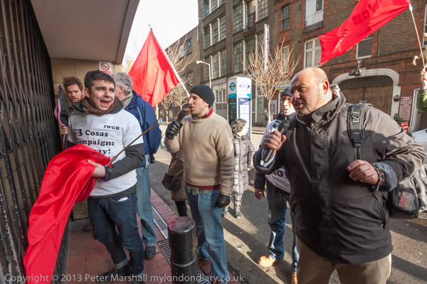 Daniel Cooper shouts through the locked gates, asking to speak to someone from Cofely GDF-Suez