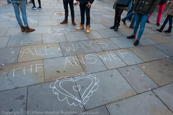 'Love is All Ways the Answer' and hearts chalked on the pavement
