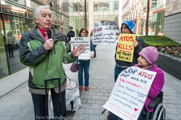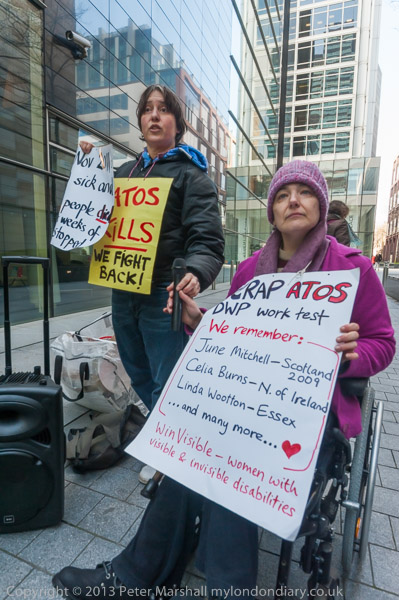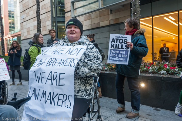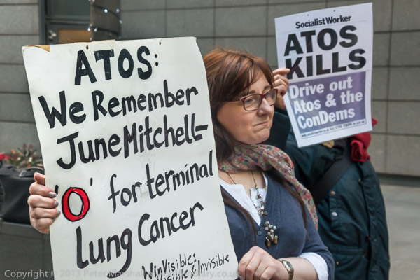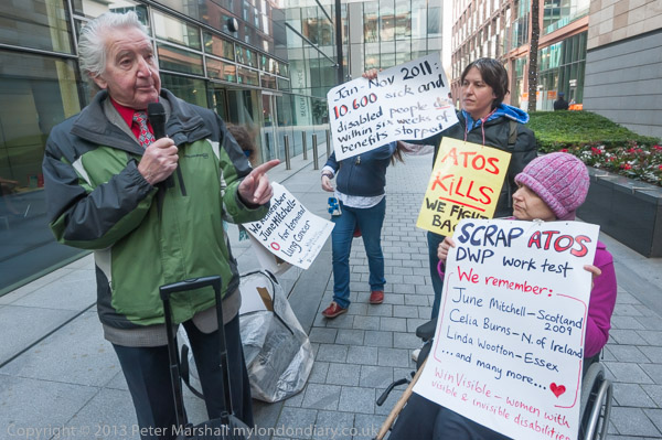 The protest outside the Atos HQ had been set to start at 10.00 am, but little was happening as I arrived