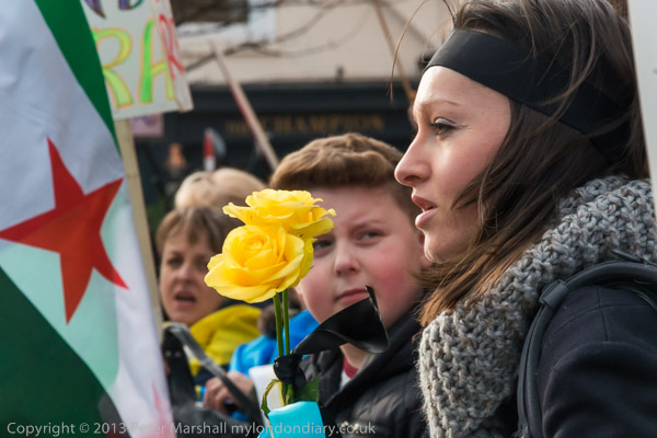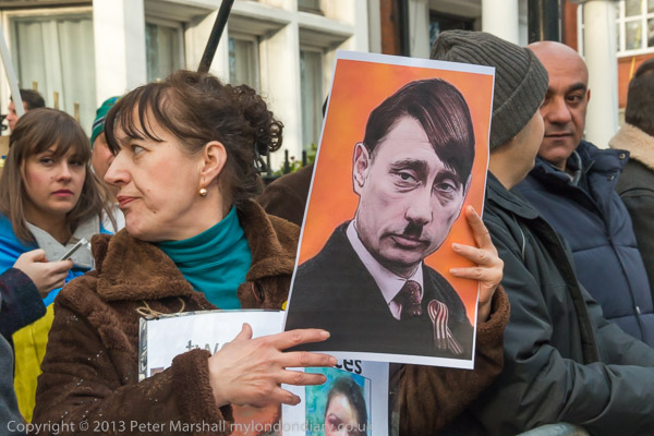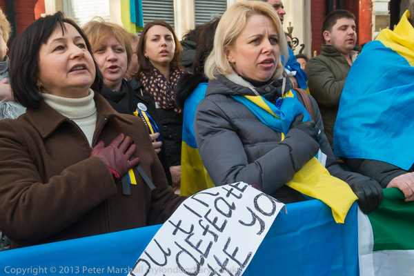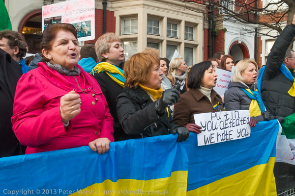 The Ukrainians protested with a Syrian flag next to the Ukrainian - both countries have suffered because of Putin's interference