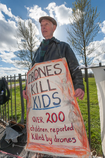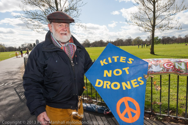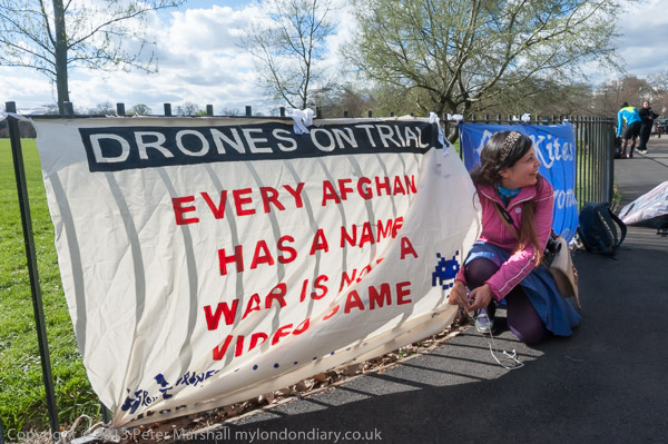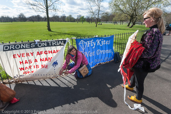 peace activist Maya Evans ties up the Drones on Trial banner 'Every Afghan has a nam, War is not a video game'