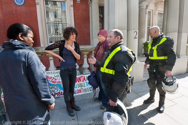 Police try to persuade the protesters to move away from the High Commision and protest across the road