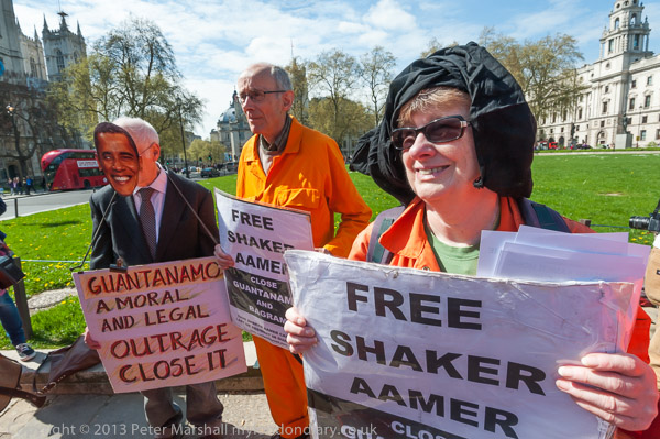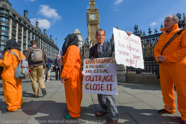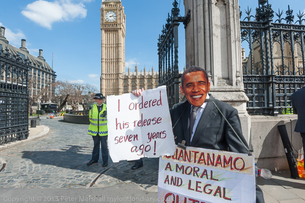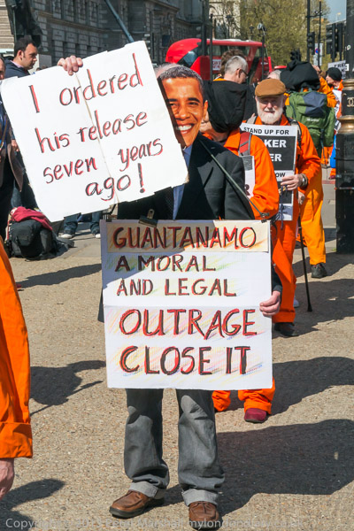 Protesters including one as President Obama get lined up to march to the Foreign Office