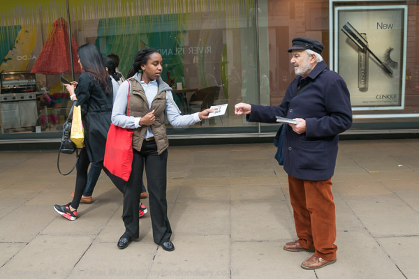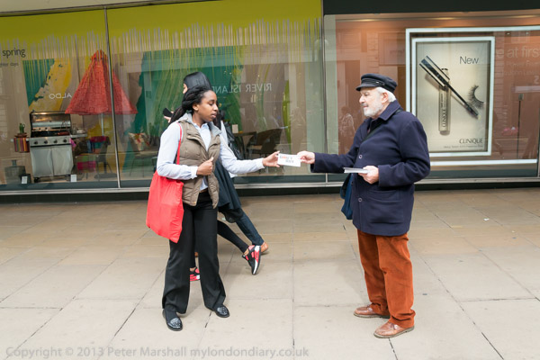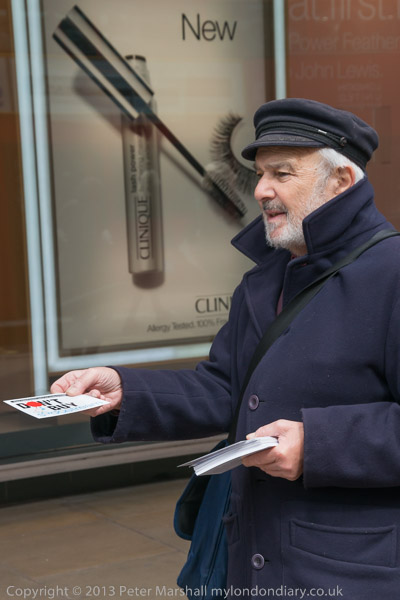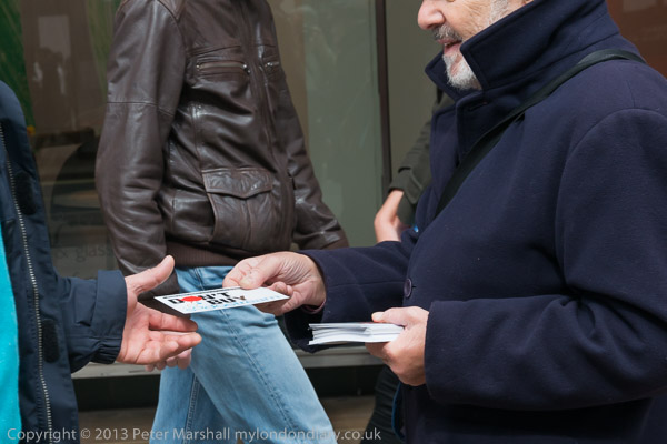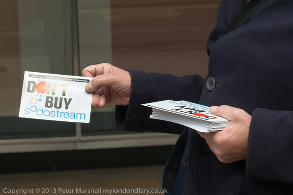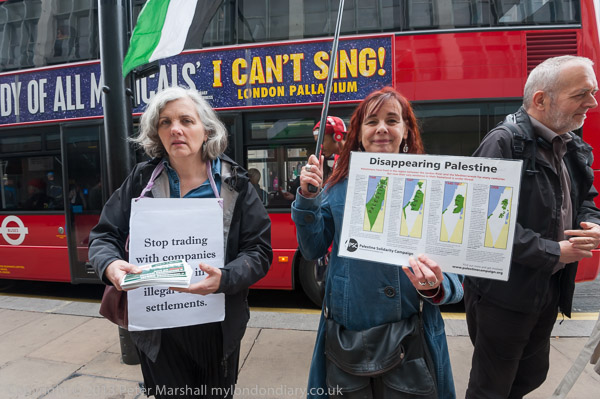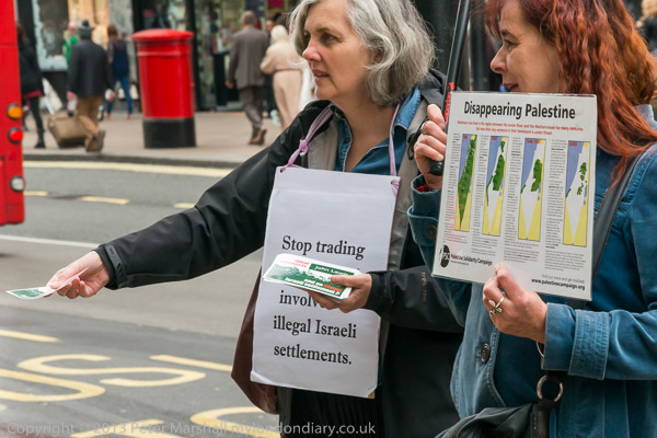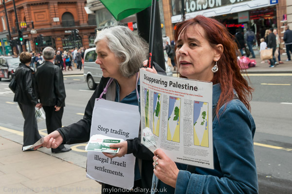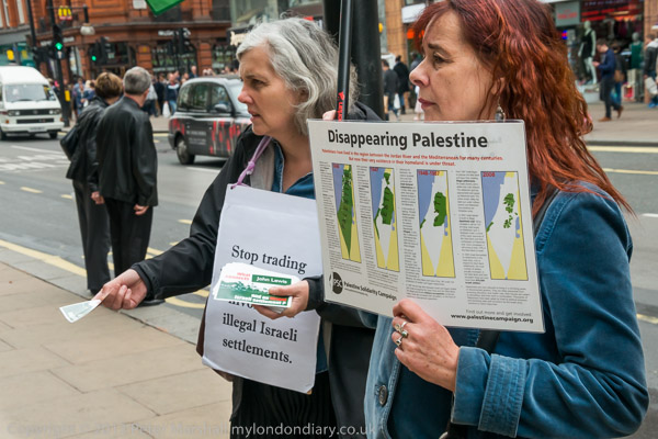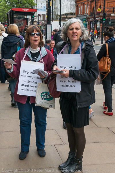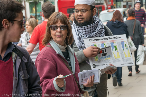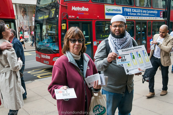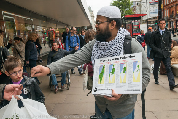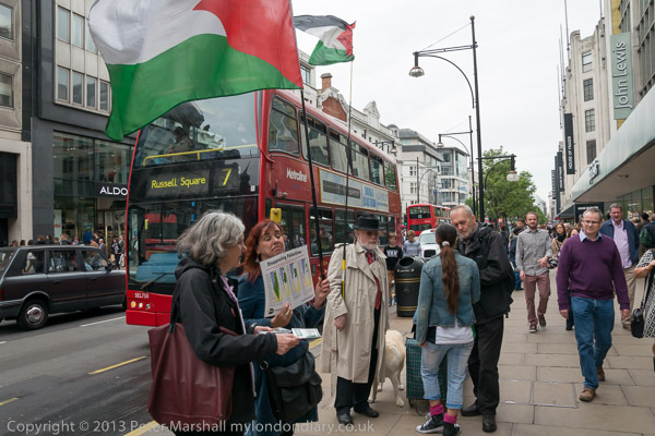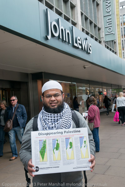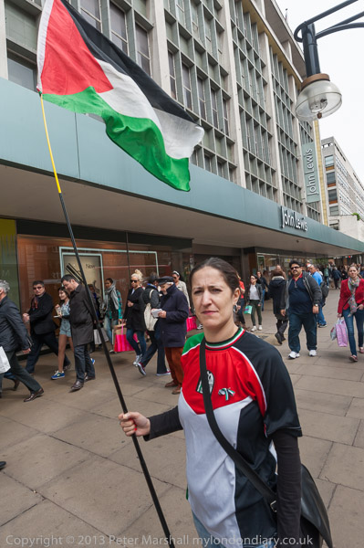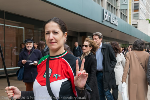 One of the protesters in a Palestian colour shirt makes a Victory sign outside John Lewis