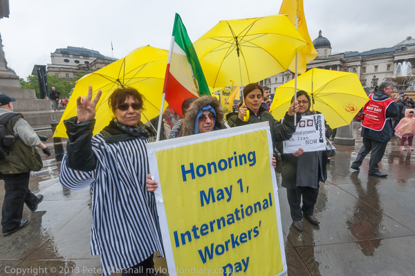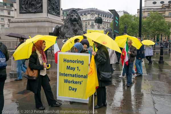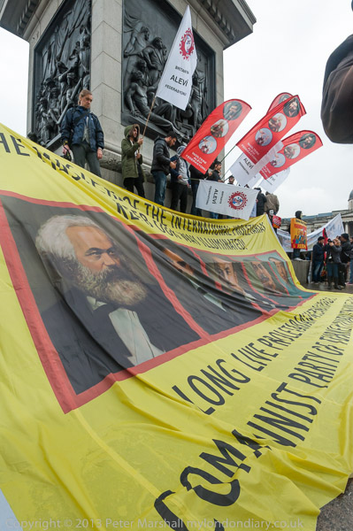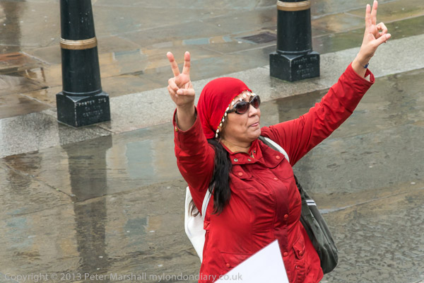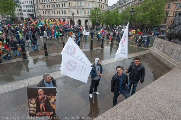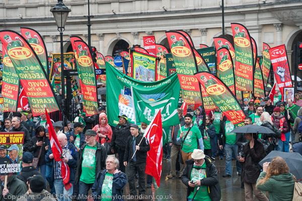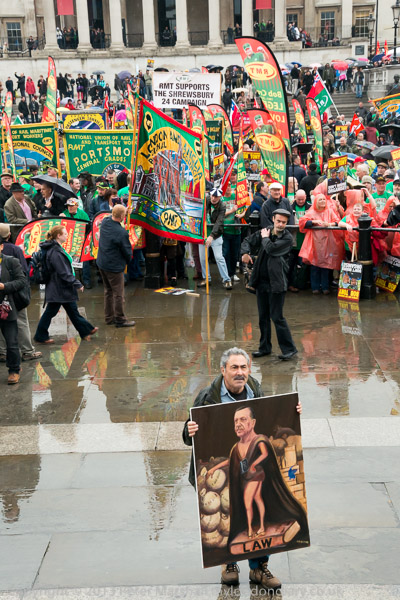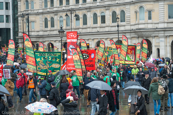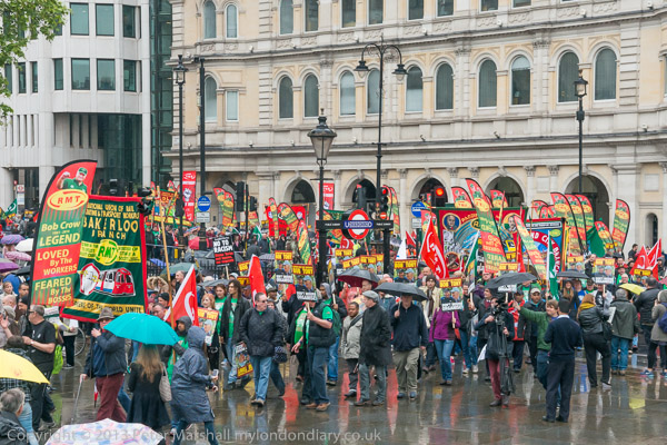 RMT marchers with Bod Crow banners come into Trafalgar Square