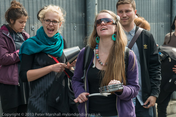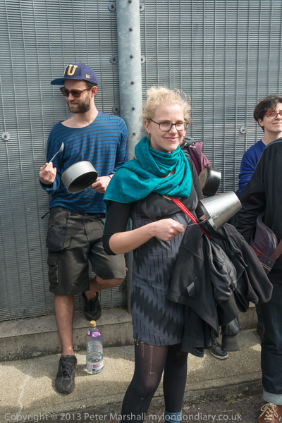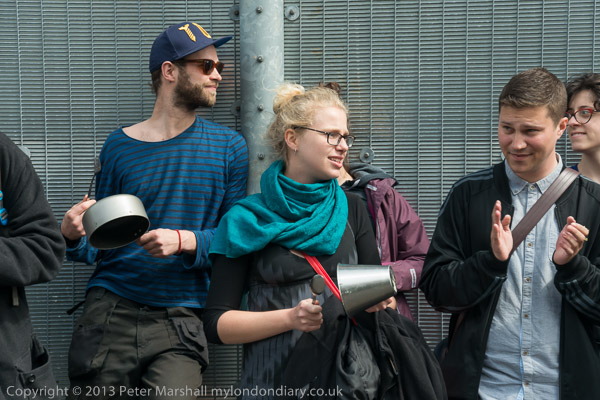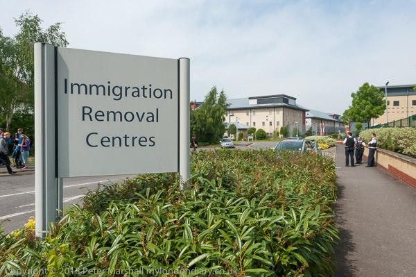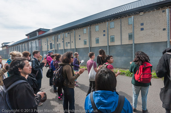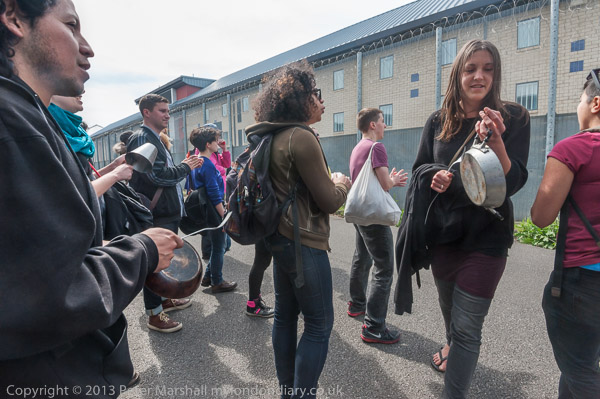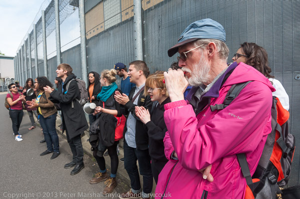 The protesters stop and face Harmondsworth Detention Centre, and make sure those inside can hear