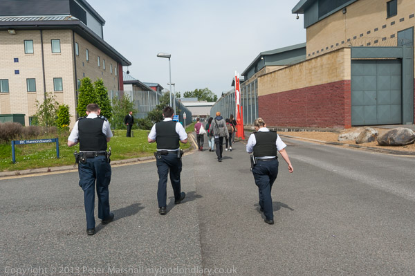 Police follow some of the protesters down the road between the two prisons which leads to a BT site at the bottom