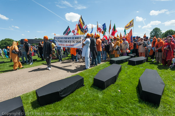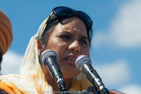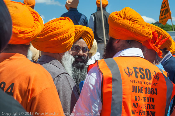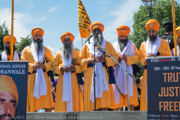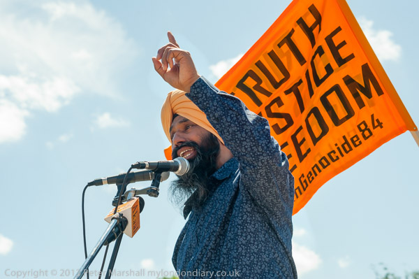 The Truth Justice Freedom #SikhGenocide84 flag behind a speaker