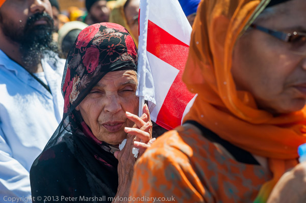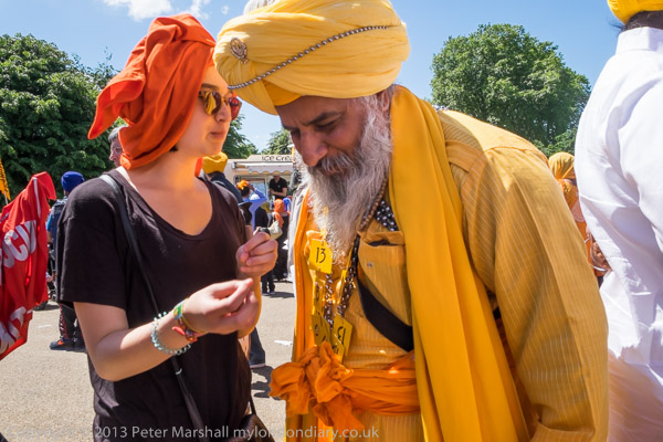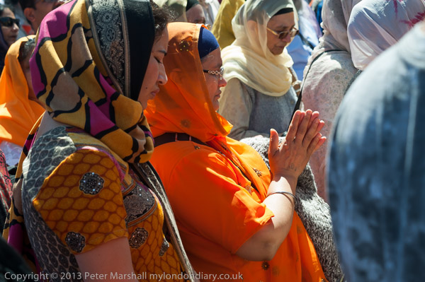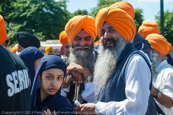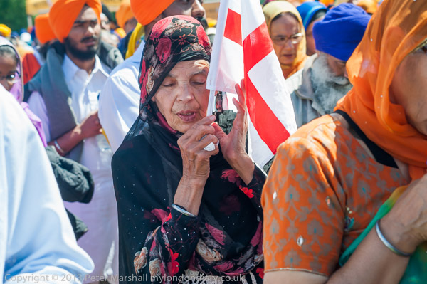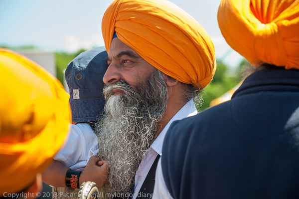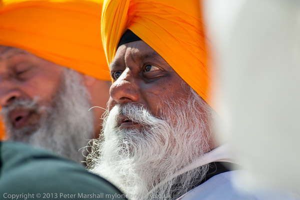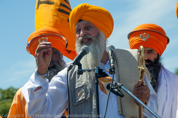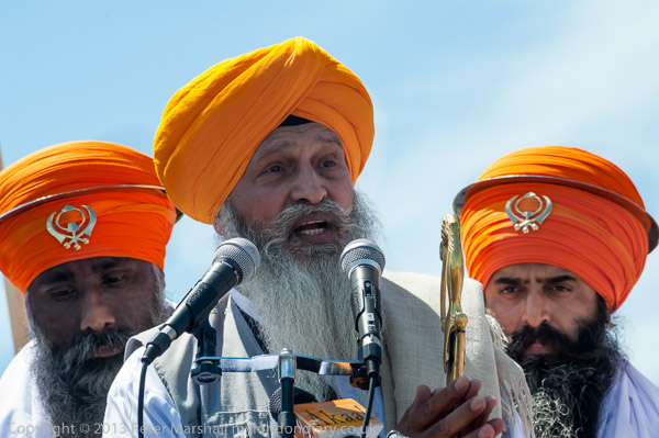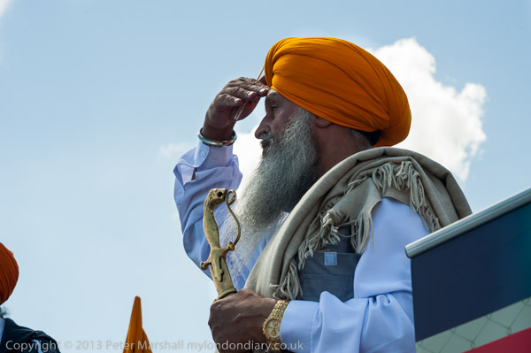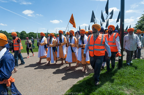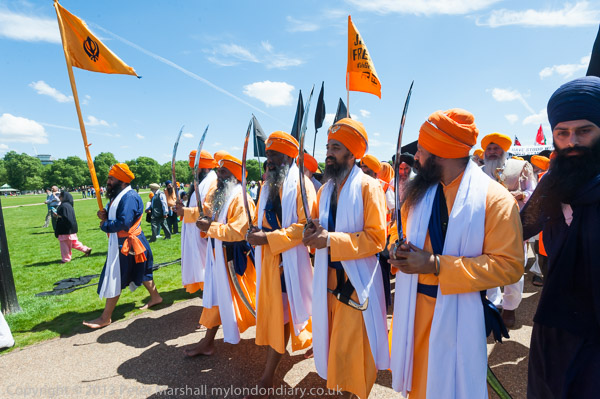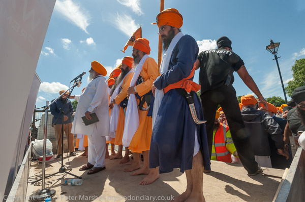One of the standard bearers and The Khalsa with raised ceremonial swords walk barefoot