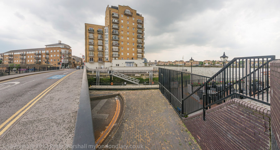 A gate with a pad to open it leads to this jetty through some flats on Narrow St
