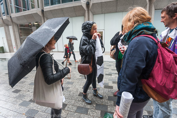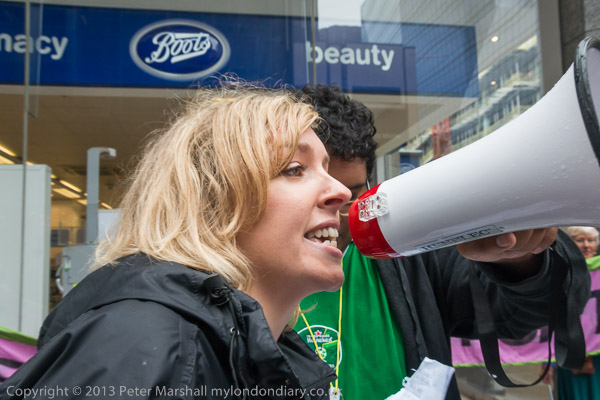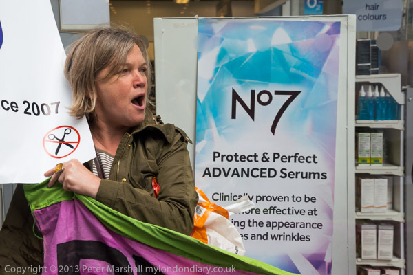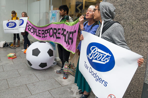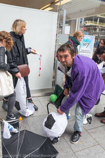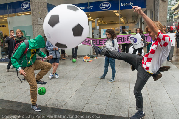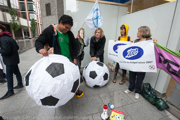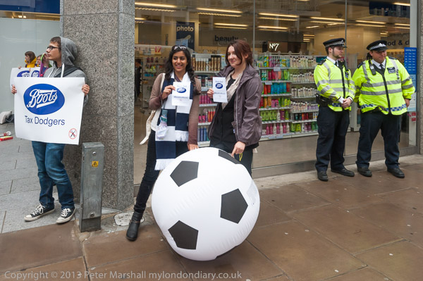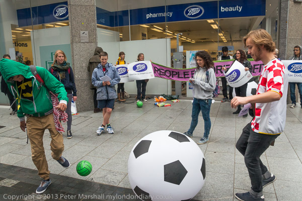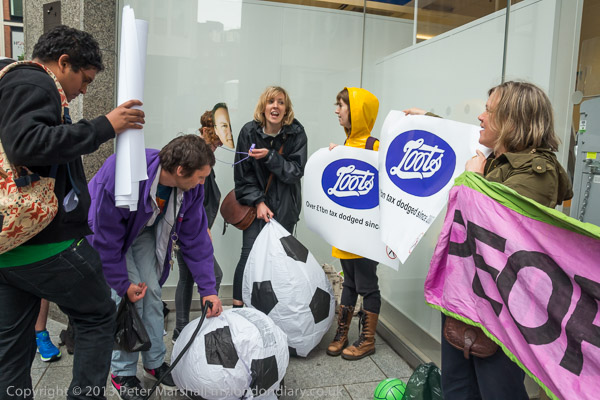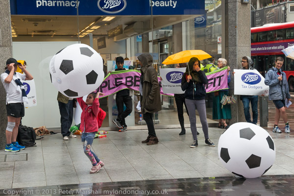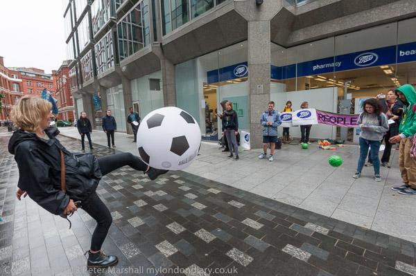 It was raining as we arrived at Boots and the protesters began to blow up the giant footballs