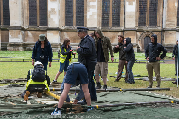 A police officer stands on the main tent so it cannot be erected