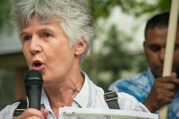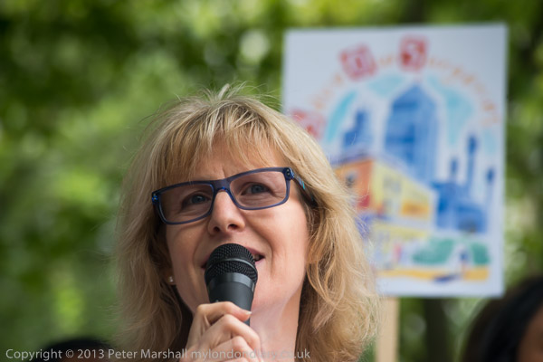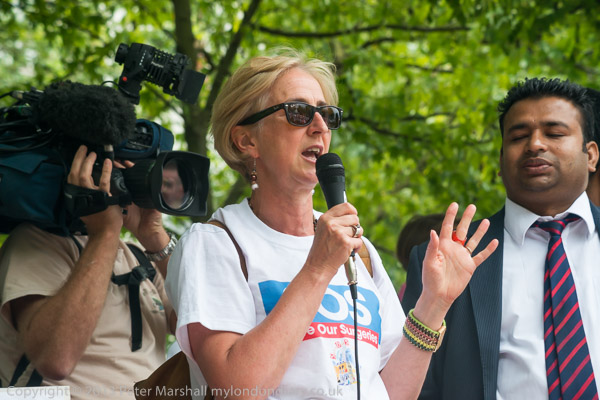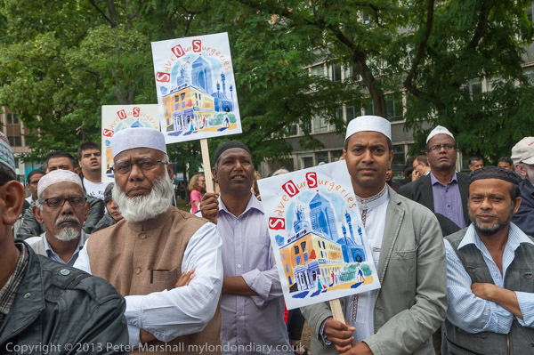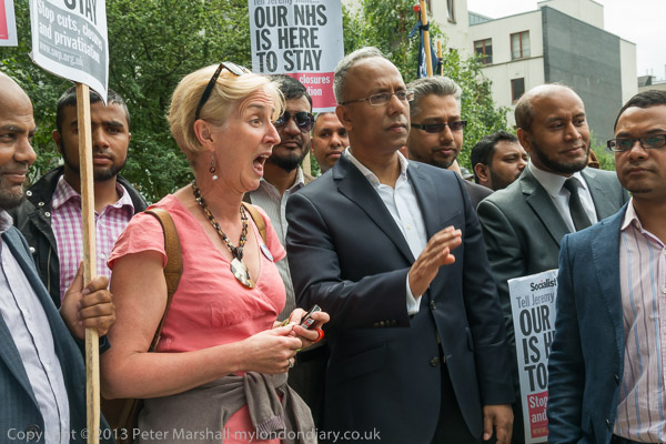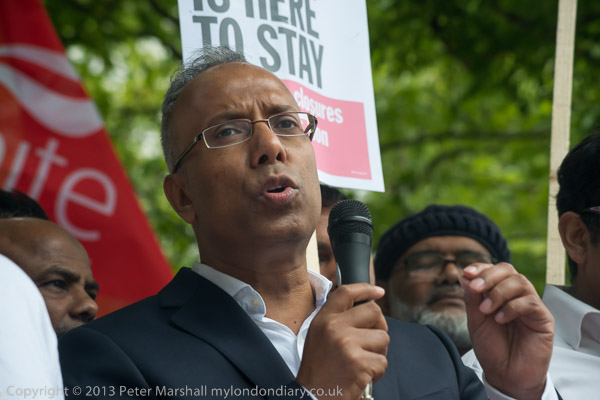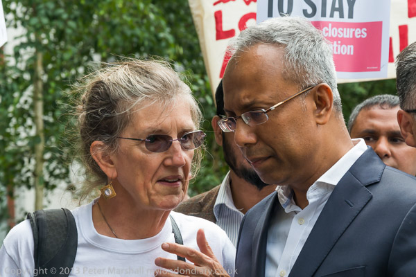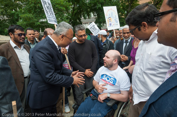 Tower Hamlets Mayor Lutfur Rahman talks with a protester