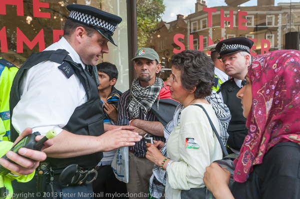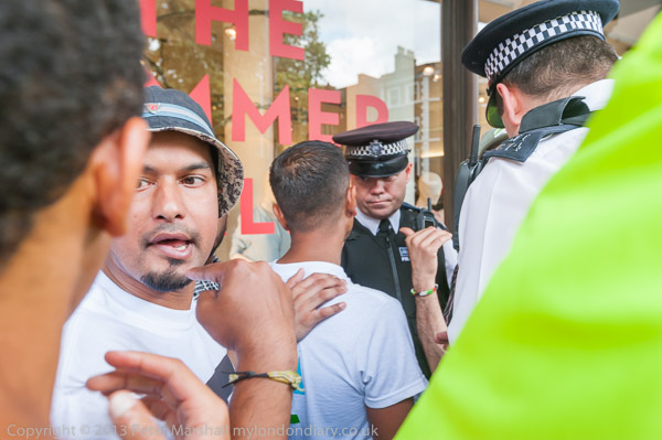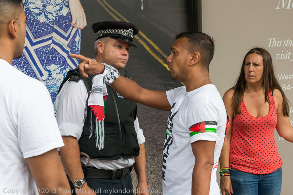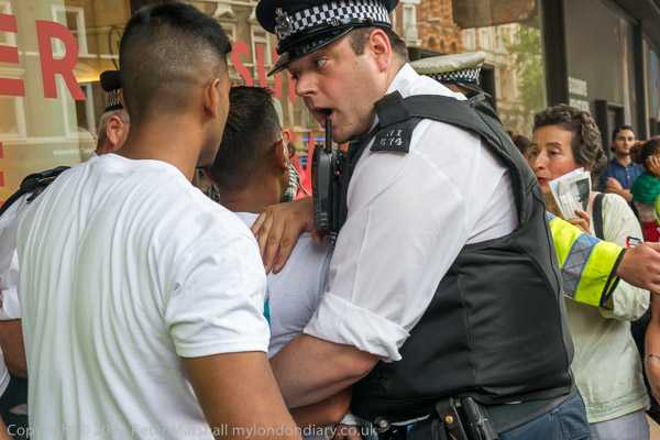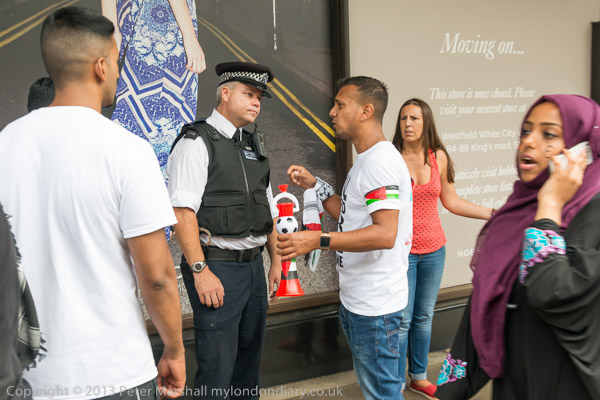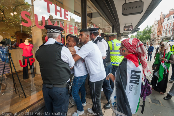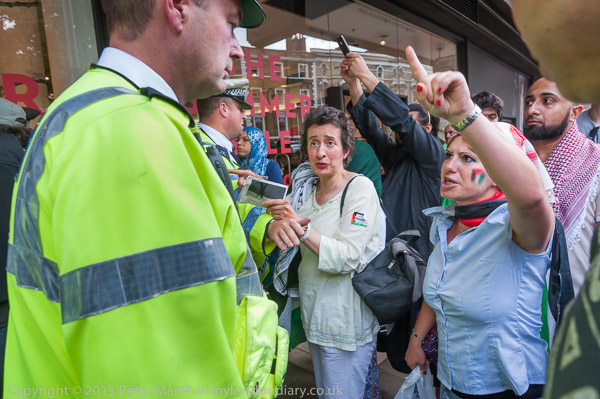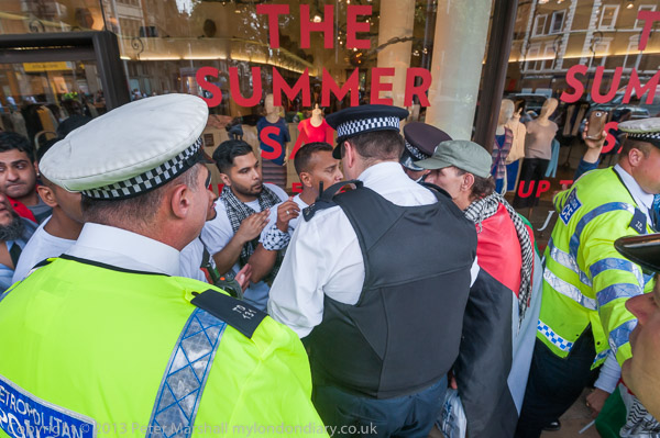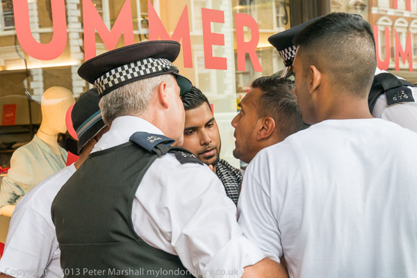 Police argue with protesters who stopped to argue with someone in a shop doorway who shouted anti-Palestine comments