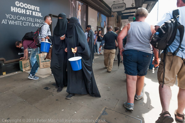 women hold collecting buckets to cover the costs of the protest as we leave High St Ken.