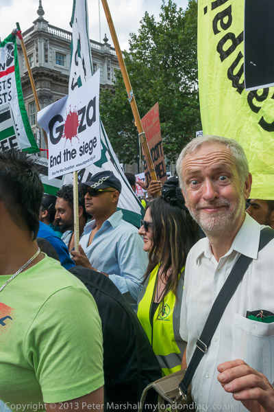 ![]() I heard the marchers as they came into Whitehall and ran to meet them ![]() There were quite a few marchers in front of the main banner, including this banner 'Zionism is the real Terrorism' ![]() The main banner was still preceded by a large group of stewards keeping photographers away ![]() I took tome pictures just behind the main banner from inside the march ![]() ![]() ![]() Stewards and banners at Downing St ![]() And Jeremy Corbyn MP sees me taking his picture ![]() I edged into the protest behind the banner and the stewards ![]() ![]() |