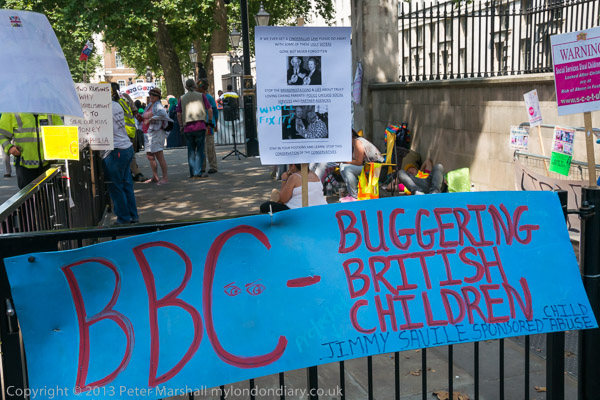 One poster was about the BBC and Jimmy Saville's record of child abuse that they failed to expose