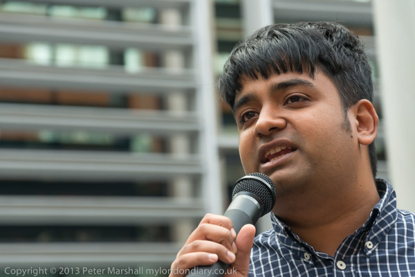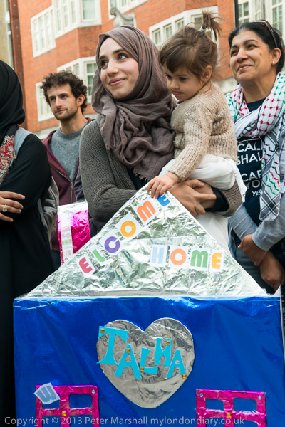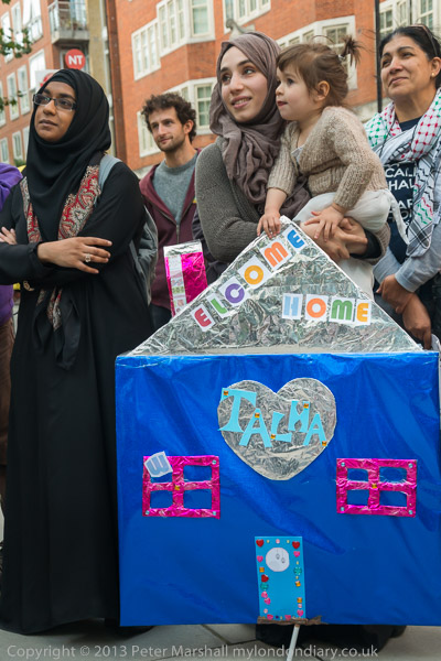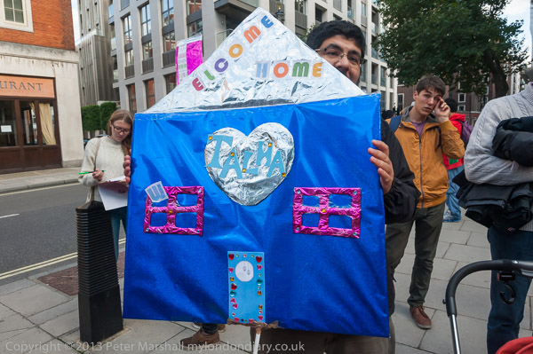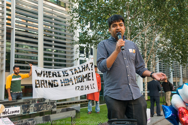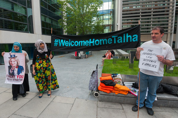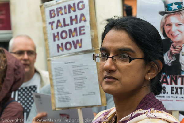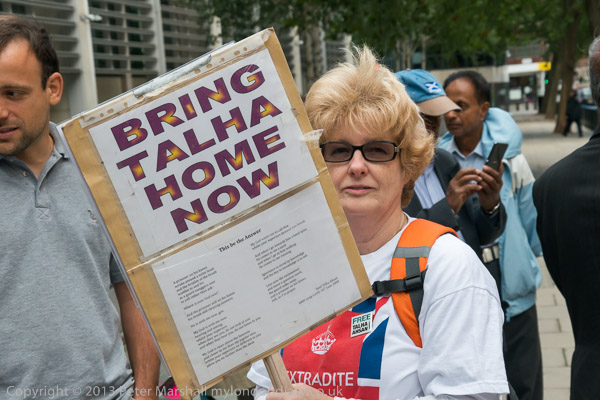 Hamja Ahsan and a banner 'Where is Talha? Bring Him Home' in front of the Home Office