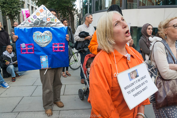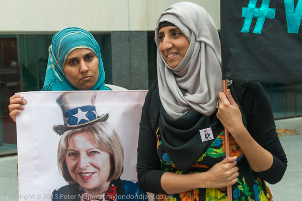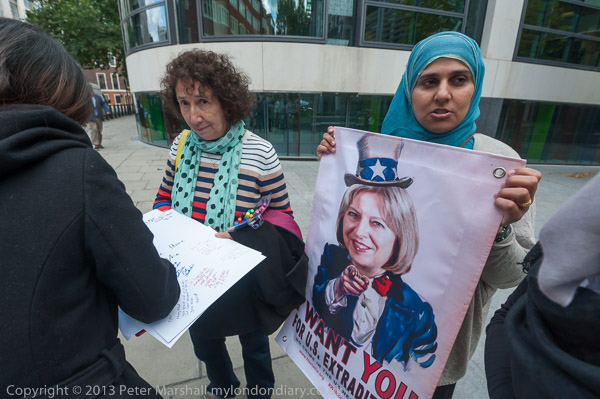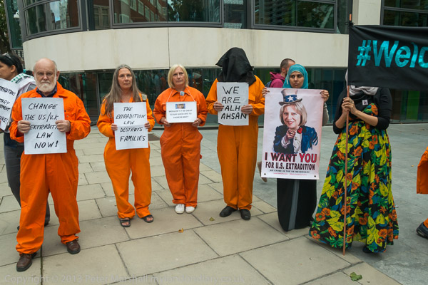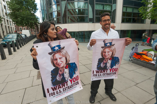 Posters showing Home Secretary Teresa May who backed the extradition of Talha Ahsan despite his