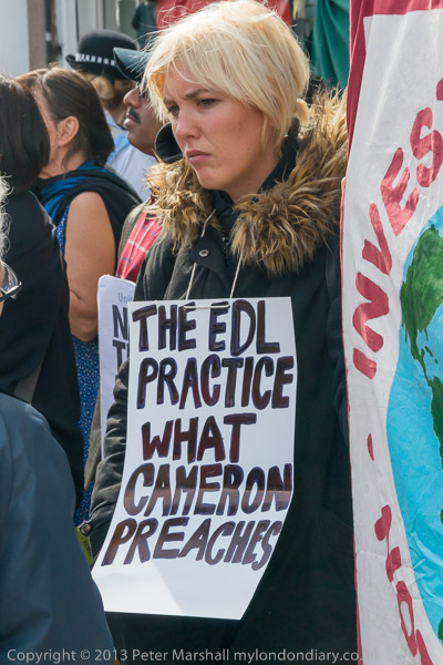 A woman holding the Global Women's Strike banner with a placard 'The EDL practice what Cameron preaches'