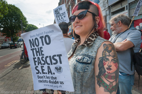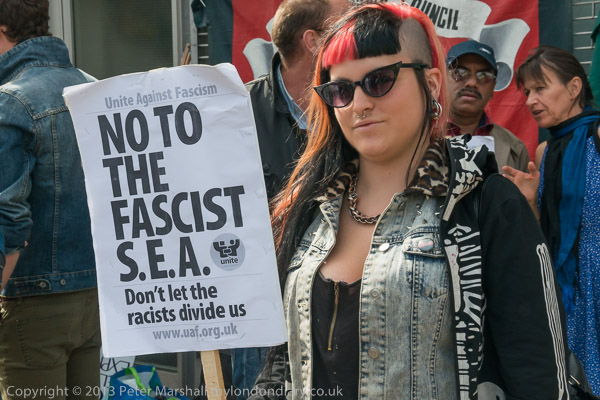 People lean on Unite Against Fascism placards 'No to the Fascist S. E. A.'