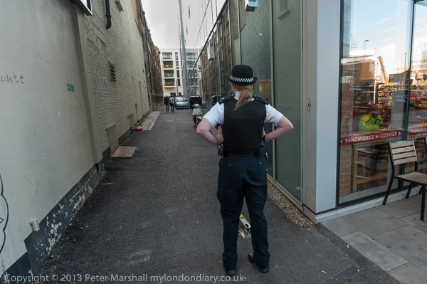 The 'poor door' leading to the 'Houblon Appartments' was even less accessible than usual this week, with the end of the alley on the main road blocked by workmen who had dug it up for emergency sewer repairs. The door could only be reached by a detour around to the rear of the large block. On it I read a notice that the door was broken, meaning that normally it had to be left open and so the residents in these flats had no security - if they forced it closed they would find themselves locked out of the building. The notice was from 'The Concierge' at One Commercial St.