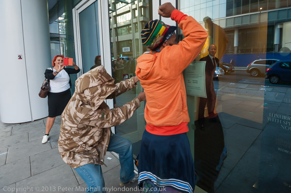 The protest at the embassy in Notting Hill was attended by around 40 people from the Metropolitan Community Church, the Out & Proud Diamond Group and the Peter Tatchell Foundation, with Peter Tatchell himself taking part. There was a great deal of loud drumming, shouting and dancing on the road and pavement in front of the protest.