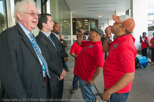 The protest, backed by groups including War on Want, the World Development Movement and Occupy London was organised at very short notice. The negotiations over CETA (Canada and European Union (EU) Comprehensive Economic and Trade Agreement) as with its wider equivalent TTIP (Transatlantic Trade and Investment Partnership) have been carried out in secret, with great care being taken to avoid any leaks and the documents are to be withheld for 30 years. Two weeks ago a protest delivered a letter to the ministers at the Department for Business, Innovation & Skills including Vince Cable, calling for the finalising of CETA to be delayed and asking for his responses to their concerns; this has been completely ignored - not even acknowledged.