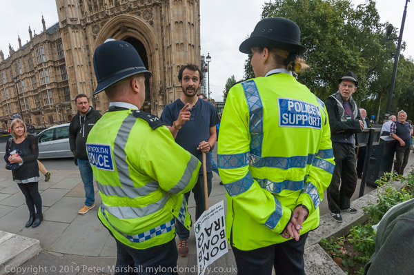 There were protests in College Green where TV crews interview politicians with a huge banner across one end and people with with placards, but police refused access to one man who TV crews had complained had been shouting. College Green, for long always open to the public and housing a well-known Henry Moore statue now has new notices stating it is a part of the Parliamentary estate, and they reserve the right to close the area to the public at any time. Until recently it was listed as a public park on the Westminster Council site.